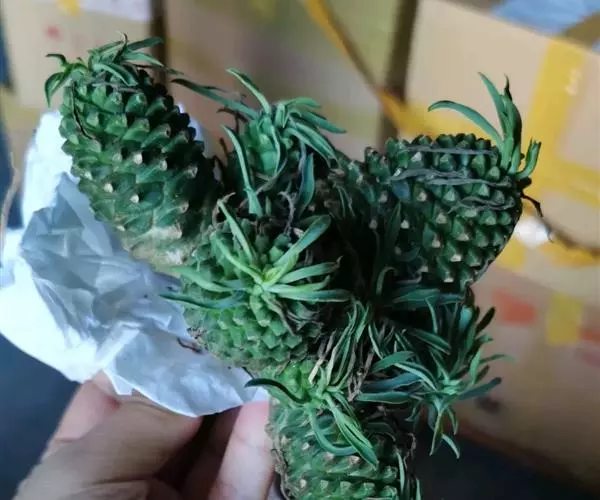 斯里兰卡凤梨 凋萎病:植株发病后,叶片变软下垂,叶色淡绿至红色,基部腐烂,最后全株枯死。此病是粉介壳虫为害所引起。