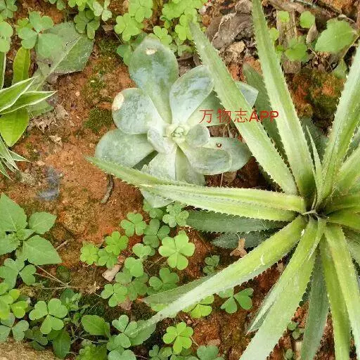 茎短。叶多数,莲座式排列,剑形,长40-90厘米,宽4-7厘米,顶端渐尖,全缘或有锐齿,腹面绿色,背面粉绿色,边缘和顶端常带褐红色,生于花序顶部的叶变小,常呈红色。