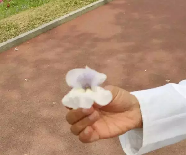 花在叶腋单生或成顶生总状花序,苞片小,卵形,先端具短尖头;花梗长2-4厘米,被短柔毛,花梗上部连同小苞片下部有巢状腺形;小苞片2,长圆卵形,长1.5-3厘米,宽1-2厘米,先端渐尖,外面及内面先端被短柔毛,边缘甚密,内面无毛,远轴面粘合在一起;花冠管长5-7毫米,连同喉白色;喉22-25毫米,自花冠管以上膨大;冠檐蓝紫色,裂片圆形或宽卵形,长2.1-3毫米,先端常微缺;雄蕊4,花丝下面逐渐变宽,长8-10毫米,无毛,花药不外露,药隔突出成一锐尖头,药室不等大,不包括刺长7和9毫米,基部具弯曲长刺,长3和2.5毫米,另2花药仅1药室具刺,长2.5毫米,在缝处有髯毛;花粉粒直径86微米。子房近无毛,花柱无毛,长17-24毫米,柱头近相等,2裂,对折,下方的抱着上方的,不外露。蒴果被短柔毛,带种子部分直径13毫米,高18毫米,喙长20毫米,基部宽7毫米。