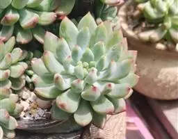 女雏是景天科石莲花属的多肉植物。特征是小巧的株形和橙粉色叶缘。极易生侧芽,…
