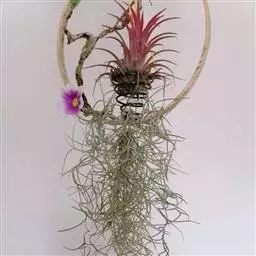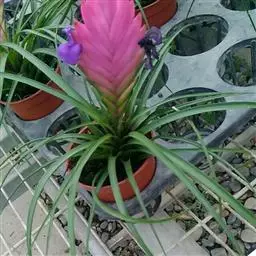 紫花凤梨(学名:Tillandsia cyanea Linden ex K. Koch)凤梨科铁兰属观赏植物。体型不大,株高不及30厘米。叶窄线形,长20厘米-30厘米,宽1-1.5厘米,簇生,浓绿色,质硬面是凹弧状,中部带有紫褐色斑晕背绿褐色。花序梗自叶丛中抽生,长约20厘米,顶端12-15厘米处扁平,形成穗状花序,宽4-4.5厘米,由粉红色近淡紫色的苞片对生组;青紫色小花由苞片内开出,约20朵之多,花瓣卵形,3片;冠径约3厘米,形似蝴蝶。苞片可观赏达数月之久。