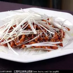 京酱肉丝 1.应选用葱的葱白部分,因为葱丝是直接食用的,所以菜刀和砧板要用开水烫过、消毒过才能切葱丝。