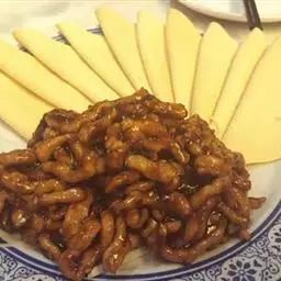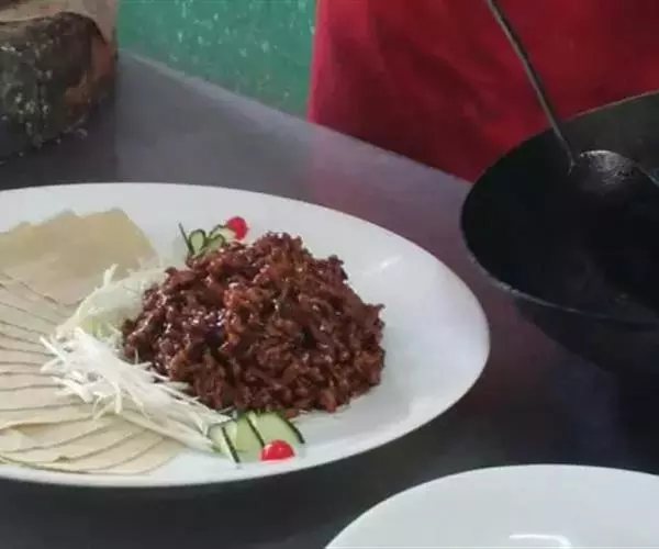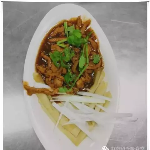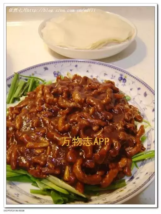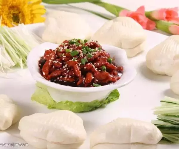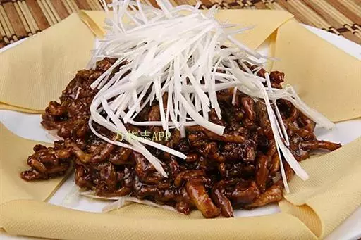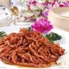 京酱肉丝精选里脊肉为主料,用酱爆烹制而成。食用时辅以葱丝、腐皮,口味咸甜适中,酱香浓郁,风味独特。