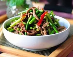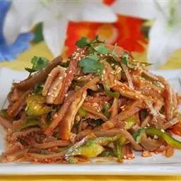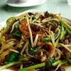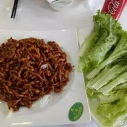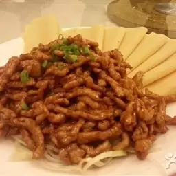 京酱肉丝,是一道知名度很高的菜肴,它是北京菜中的经典代表菜之一。制作时选用猪瘦肉为主料,辅以甜面酱、葱、姜及其它调料,用北方特有烹调技法“六爆”之一的“酱爆”烹制而成。 成菜后,咸甜适中,酱香浓郁,风味独特。