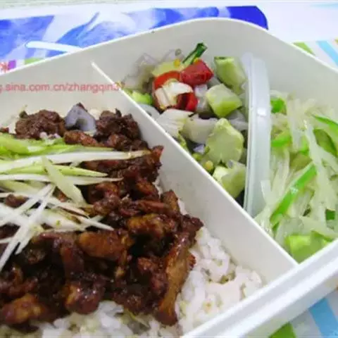 京酱肉丝 1.猪肉切成丝,加入1汤匙料酒、1/5汤匙盐、1/2只鸡蛋清、1汤匙生粉和1/3汤匙鸡粉抓匀,腌制15分钟。