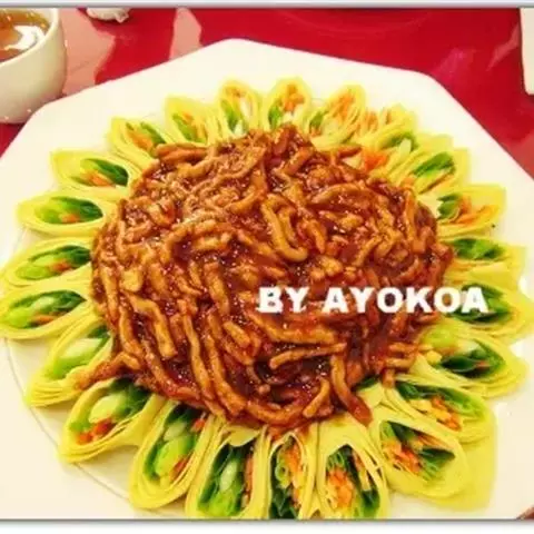 1、将里脊肉切成筷子粗的丝、葱切丝、豆腐皮切5*5CM的大块备用。 京酱肉丝做法图示