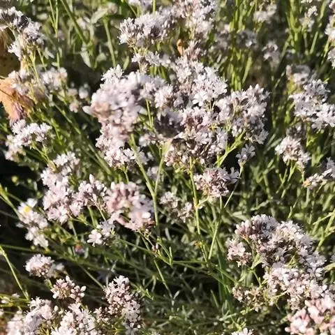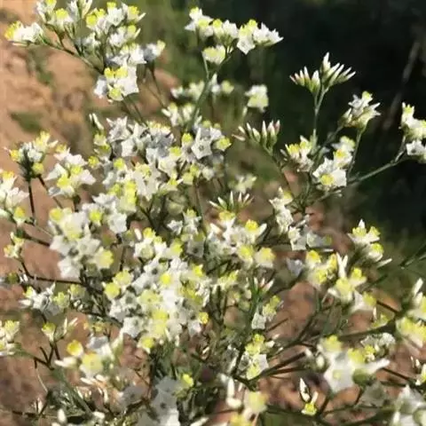 二色补血草(学名:Limonium bicolor (Bag.) Kuntze):白花丹科,补血草属多年生草本植物。高可达60厘米,全体光滑无毛。茎丛生,直立或倾斜。叶多根出;匙形或长倒卵形,基部窄狭成翅柄,近于全缘。花茎直立,多分枝,花序着生于枝端而位于一侧,或近于头状花序;萼筒漏斗状,棱上有毛,白色或淡黄色,宿存;花辩匙形至椭圆形;雄蕊着生于花瓣基部;蒴果5棱,包于萼内。为盐碱地拓荒植物。