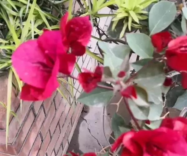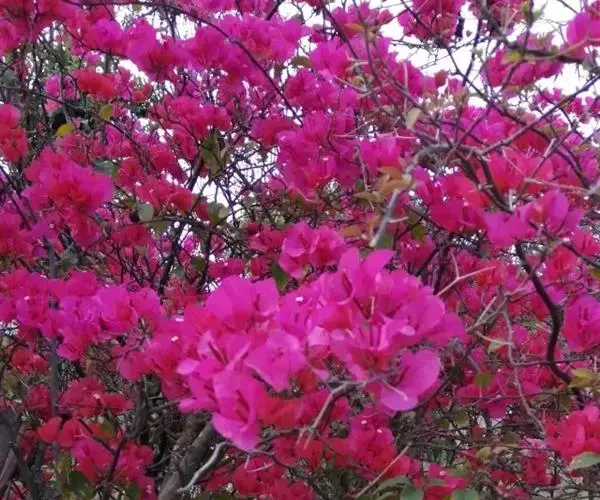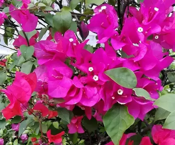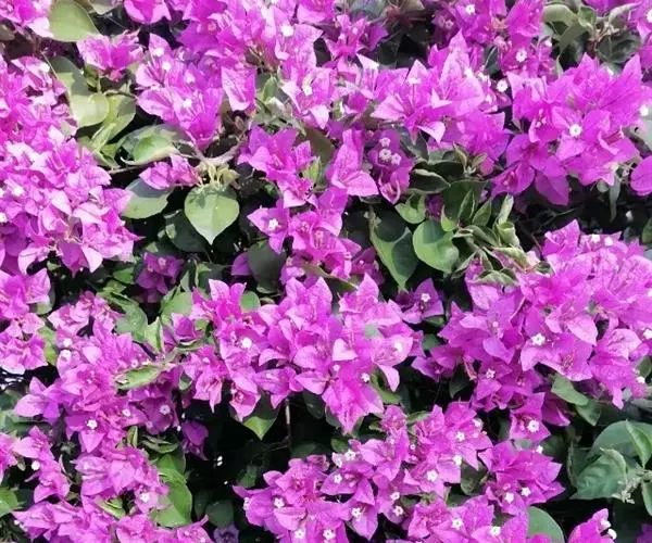 叶子花(学名:Bougainvillea spectabilis Willd.),紫茉莉科,叶子花属木质藤本状灌木,茎有弯刺,并密生绒毛。单叶互生,卵形全缘,被厚绒毛,顶端圆钝。花很细小,黄绿色,三朵聚生于三片红苞中,外围的红苞片大而美丽,有鲜红色、橙黄色、紫红色、乳白色等,被误认为是花瓣,因其形状似叶,故称其为叶子花。花期可从11月起至第二年6月。冬春之际,姹紫嫣红的苞片展现,给人以奔放、热烈的感受,因此又得名贺春红。