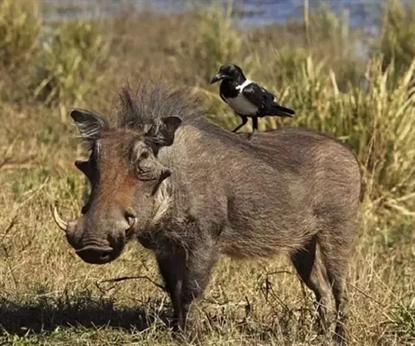 非洲疣猪是很多非洲食肉动物的捕食对象,包括斑点猎狗、野狗、印度豹、狮子、豹和老鹰等等。当危险来临时,如果可能它们会尽可能退到它们的洞穴里。在战斗中,非洲疣猪能用长长的下犬齿进行防守,让它们占到多一些优势。除了掠食者外,疣猪对非洲大草原上的其它动物毫不在意,它们会和平的做自己的事。黄犀鸟就是和飞洲疣猪有共同生活关系的鸟类,它们被允许可以吃掉在疣猪身上的寄生虫。