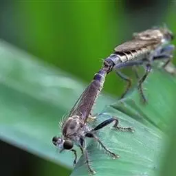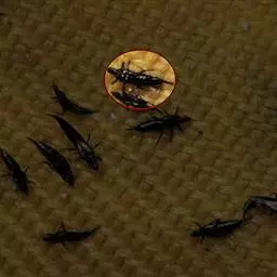 4.成虫:新出生的蚊子在翅膀没有硬(羽化)之前无法起飞。雄蚊在羽化后24小 蚊子成虫 时之内其腹节第八节以后全部反转180°完成交配姿势。交配的动作因种类而有不同,有的黄昏时刻在田野广旷或草地之处形成蚊柱作群舞。蚊柱不一定单纯由一种雄蚊聚集而成,往往有几种不同蚊种集合而成。此时雌蚊见到群舞光景,就飞近蚊柱与同种雄蚊交配离去。交配通常需要10~25秒。雌蚊一生只交配一次,交配后由雄性副腺分泌的液体,形成交配栓于雌性交配孔内,但逐渐溶解,约于24小时后完全消失。一生只交配一次,后其一生(90多天后)产下的卵尚可受精。