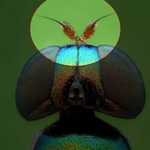 头部:似半球形,有复眼和触角各1 对,喙1 支。触角(Antenna)有15 节:第一节称柄节(Scape),第二节称梗节(Torus),第三节以后各节均细长称鞭节(Flagellum)。各鞭节轮生一圈毛,雌蚊的轮毛短而稀,雄蚊的轮毛长而密。在雌蚊触角上,除轮毛外,还有另一类是短毛,分布在每一鞭节上,这些短毛对空气中化学物质的变化产生反应,对二氧化碳、乳酸等化合物和湿度尤其敏感,起寻找吸血对象作用的是短毛,而不是复眼。