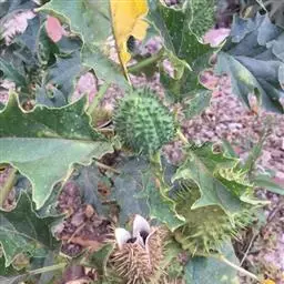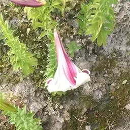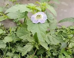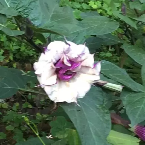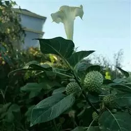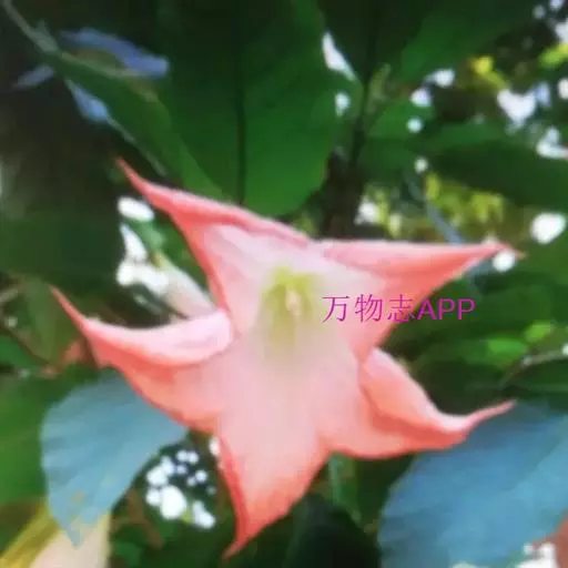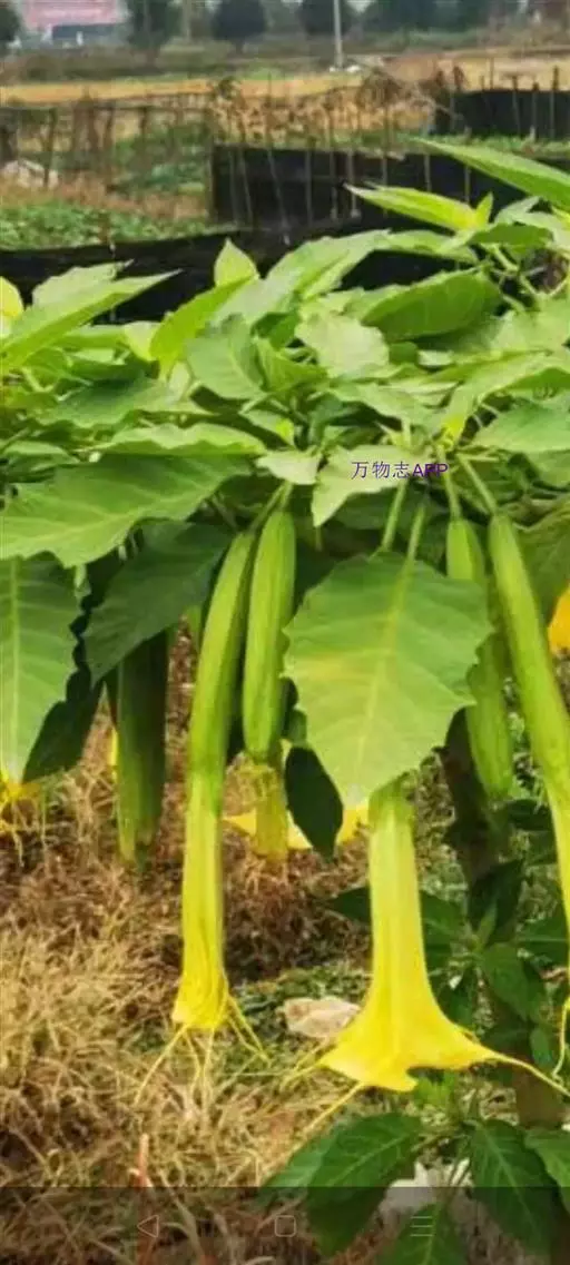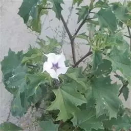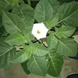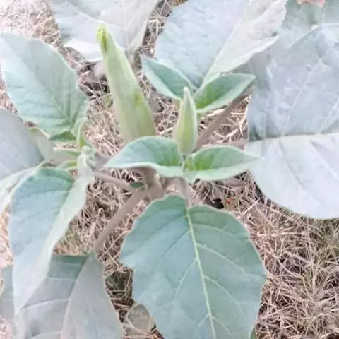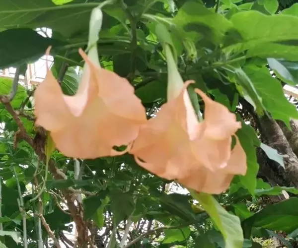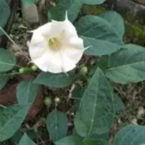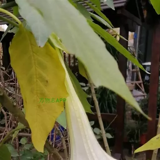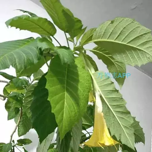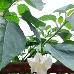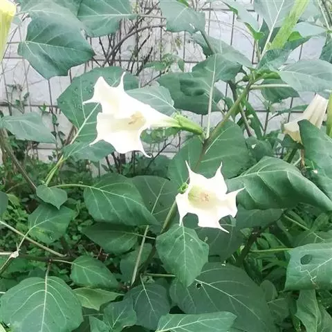 木本曼陀罗,为茄科、曼陀罗属的小乔木,茎粗、叶大,叶卵状心形,顶端渐尖,长15-28厘米,宽8-15厘米,嫩枝和叶两面均要被柔毛,花白色,喇叭状下垂,长达20余厘米,花期6-10月。其洁白硕大的花朵下垂悬吊,犹如灯笼,是种观赏价值很高的花木。