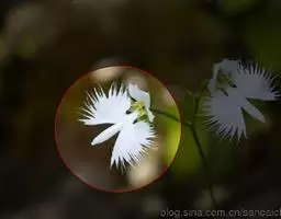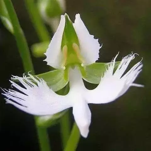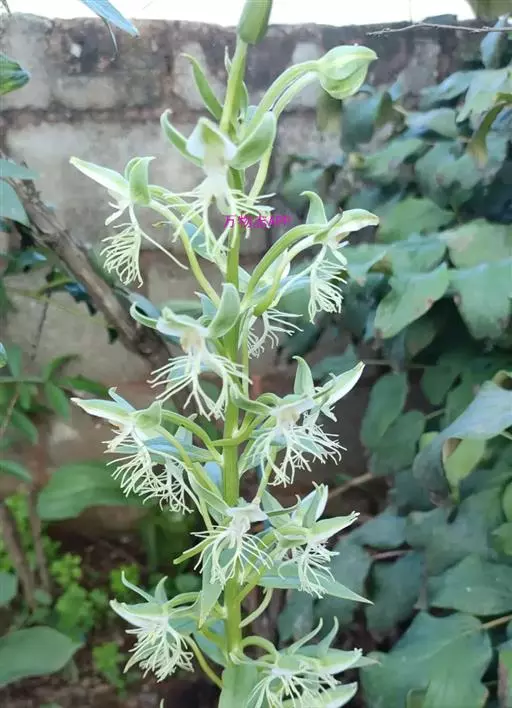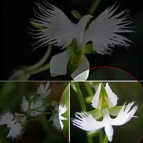 植株高65-75厘米,干后变成黑色。块茎肉质,长圆形,长2-5厘米,直径0.8-1.5厘米。茎粗壮,直立,圆柱形,直径4-6毫米,具5-7枚叶。叶片卵形、卵状长圆形至长圆状披针形,长5-12厘米,宽1.5-4.5厘米,先端渐尖,基部抱茎,向上逐渐变小。总状花序具4-15朵花,长4-21厘米;花苞片披针形,长达4.5厘米,宽约1厘米,先端渐尖,下部的长于子房;子房圆柱形,扭转,无毛,连花梗长2.5-3.5厘米;花大,绿白色或白色;萼片淡绿色或白色,边缘具缘毛,中萼片长圆形,直立,凹陷呈舟状,长1.5-1.8毫米,宽6-7毫米,先端钝,具5脉;侧萼片反折,斜卵状披针形,长1.7-2厘米,宽6-8毫米,先端渐尖,具5-7脉;花瓣白色,直立,斜披针形,近镰状,不裂,外侧边缘不臌出,长1.4-1.7厘米,宽3-4毫米,先端近急尖,具3-5脉,边缘具缘毛,与中萼片靠合呈兜状;唇瓣白色或淡黄色,长2.5-3厘米,基部不裂,在基部以上3深裂,裂片具缘毛;中裂片线形,长20-25毫米,先端急尖,与侧裂片近等长;侧裂片线形,外侧边缘为蓖齿状深裂,细裂片7-10条,丝状;距细圆筒状,下垂,长4.5-6.5厘米,稍弯曲,末端稍膨大而钝,较子房长,甚至超出近1倍;花药直立;药隔顶部截平,宽4毫米,药室叉开,伸长;花粉团狭椭圆形,长4毫米,具线形、长5毫米且向上弯的柄和粘盘,粘盘小,近圆形;柱头的突起物细长,棒状,长5毫米,约与药室等长,前部镰状膨大,且向上弯曲;退化雄蕊小,长椭圆形。花期6-8月。