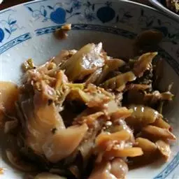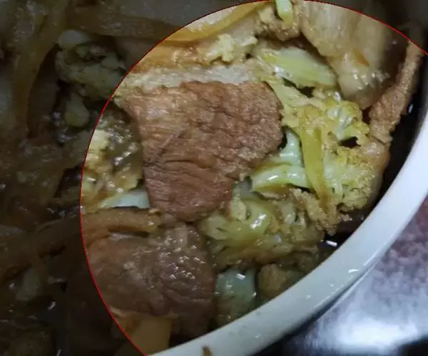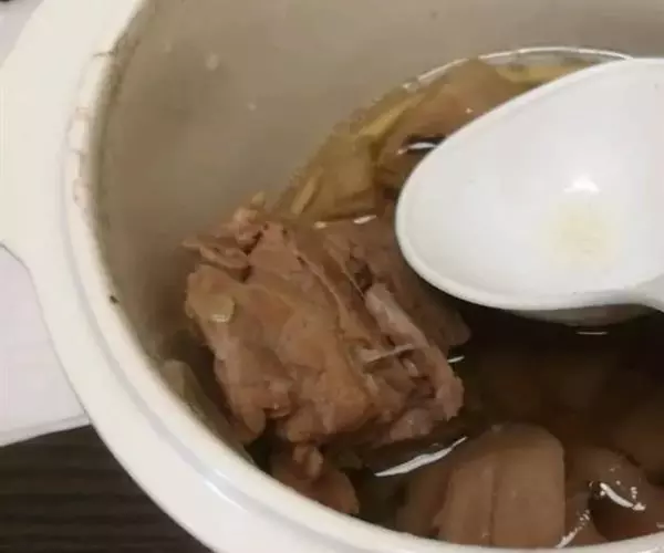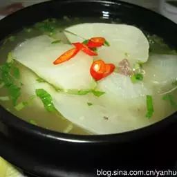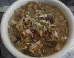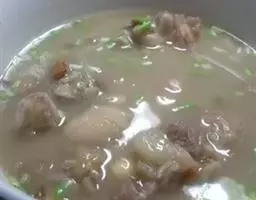 4、取煲好牛杂及适量的牛杂汤,再放入适量萝卜,小火慢熬,熬半小时(作用是使萝卜和味)关火即可出售。出售时用剪刀把牛杂剪成若干小块装入一次性小碗里(在西关的牛杂,是完全切好再煲的,就不用剪的),应顾客要求加入少许牛杂汤,放入辣酱或甜酱,撒香葱即可。