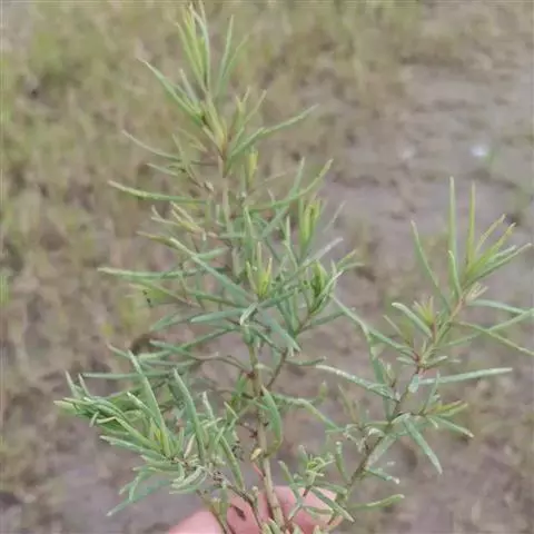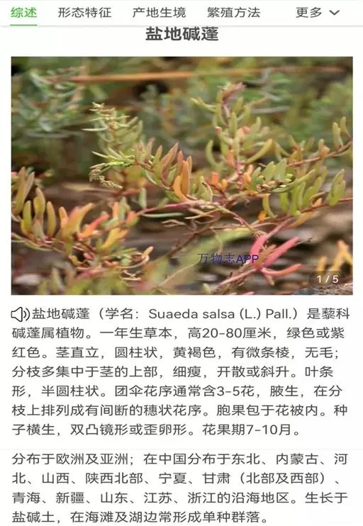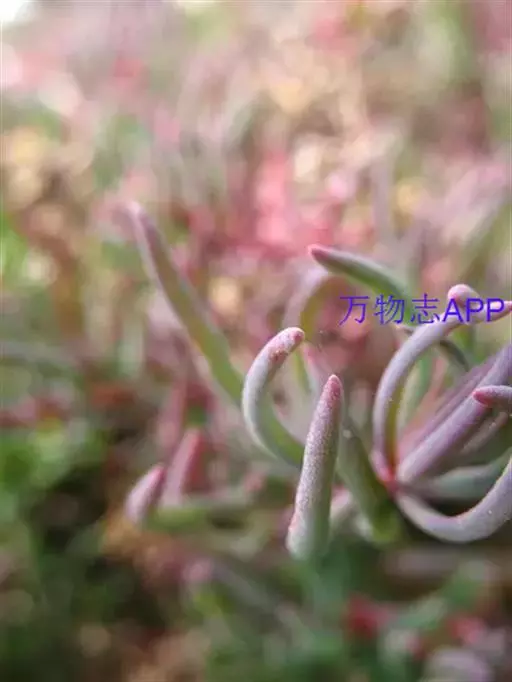 一年生草本,高20-80厘米,绿色或紫红色。茎直立,圆柱状,黄褐色,有微条棱,无毛;分枝多集中于茎的上部,细瘦,开散或斜升。叶条形,半圆柱状,通常长1-2.5厘米,宽1-2毫米,先端尖或微钝,无柄,枝上部的叶较短。