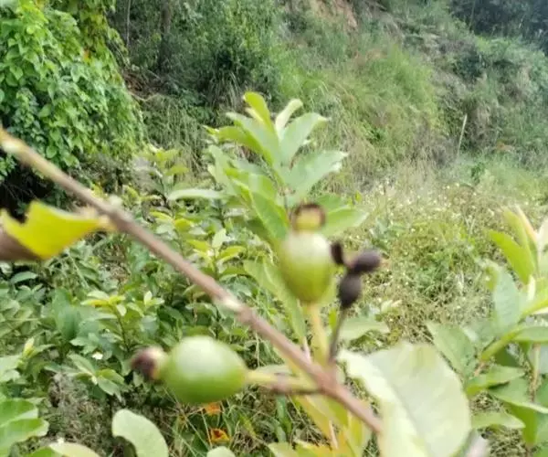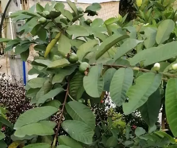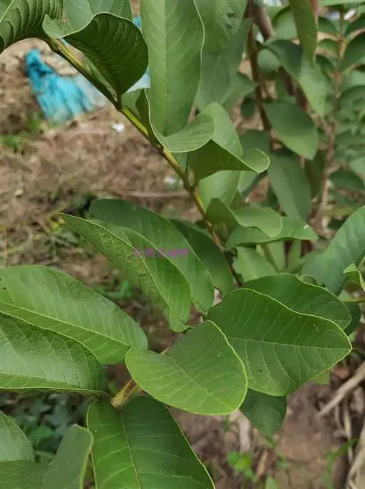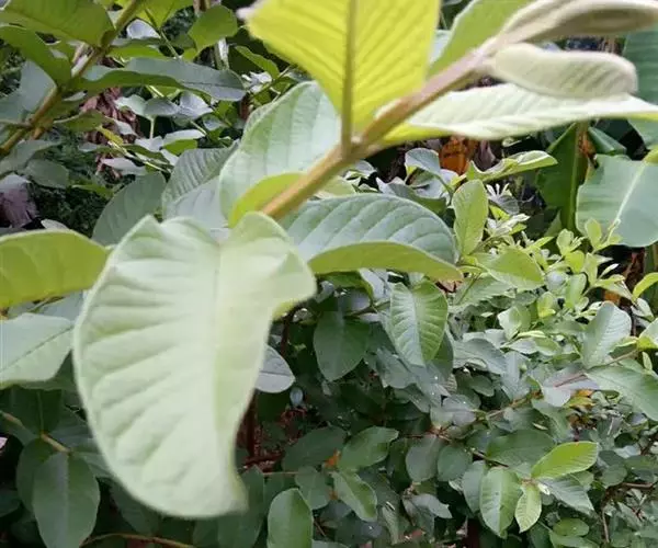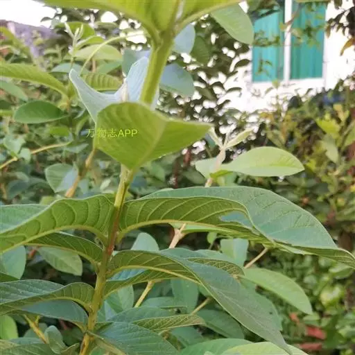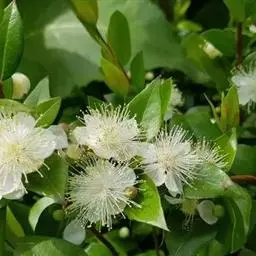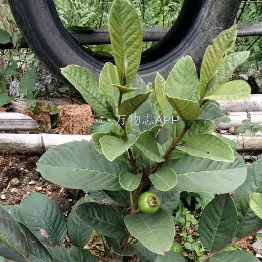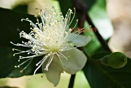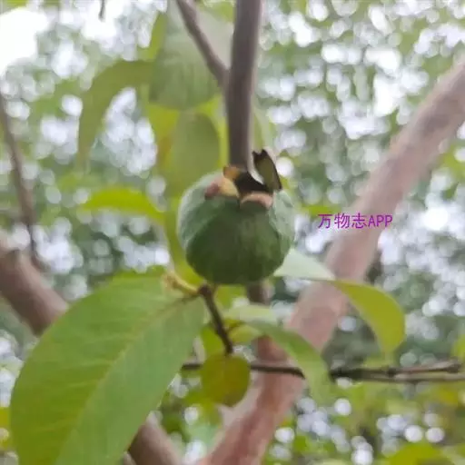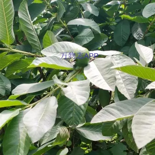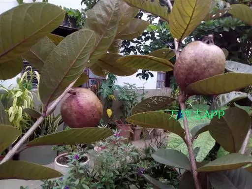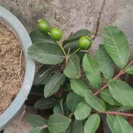 番石榴(Psidium guajava Linn.别名:芭乐,鸡屎果,拔子,喇叭番石榴)桃金娘科乔木,高达13米;树皮平滑,灰色,片状剥落;嫩枝有棱,被毛。叶片革质,长圆形至椭圆形,先端急尖或者钝,基部近圆形,上面稍粗糙,下面有毛,侧脉常下陷,网脉明显;叶柄长5毫米。花单生或者2-3朵排成聚伞花序;萼管钟形,有毛,萼帽不规则裂开;花瓣白色;雄蕊长6-9毫米;子房下位,与萼合生,花柱与雄蕊同长。浆果球形、卵圆形或梨形,顶端有宿存萼片,果肉白色及黄色,胎座肥大,肉质,淡红色;种子多数。