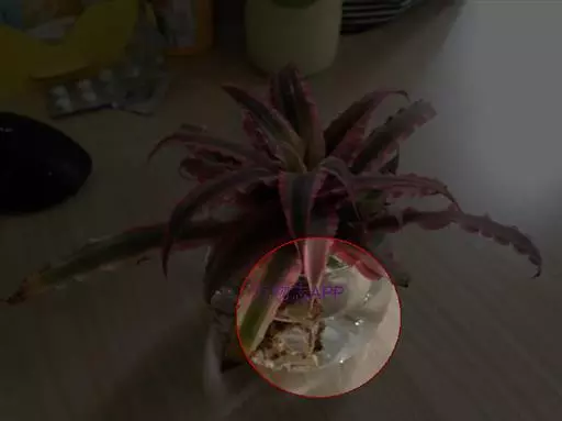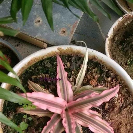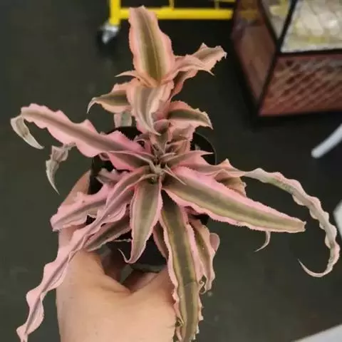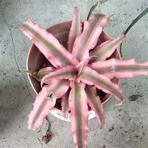 多年生肉质常绿地生性草本植物,植株高约10-50厘米,外轮叶腋具有匍匐茎,叶片从根茎处旋叠状丛生,向上辐射性发生,成为莲座状。叶片质坚硬厚,呈带状尖形或椭圆状披针形,近茎干基部的叶片逐渐缩短,在植株中心互相抱合,形成贮水不漏的杯状叶筒,俗称“水杯”。若把水浇在杯中,基部的鳞毛也能吸收。叶片革质,叶缘大部分呈现波浪状或锯齿形,有的具有短刺。叶色艳丽,形态奇特,背面被白色鳞片,表面有红、黄、绿、褐、紫等多种颜色,有规则地呈现波浪、螺旋斑点等千姿百态的花纹。更具风韵的是,姬风梨的叶脉、花纹随着阳光的强弱而随之变化,叶色时浅时深,花纹时淡时浓。花朵聚集成近似无柄的花序,它隐藏于莲座状的叶丛之中,花头圆锥形、棒形或松散的伞形。经人工授粉,可以结实。