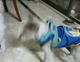 10.如果是幼犬,一定要注意保暖,窝里要铺上衣物,最好用旧的衣袖改成小衣服穿上。