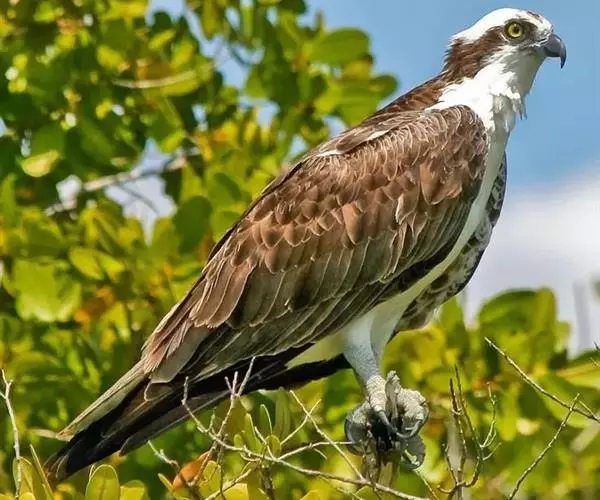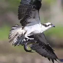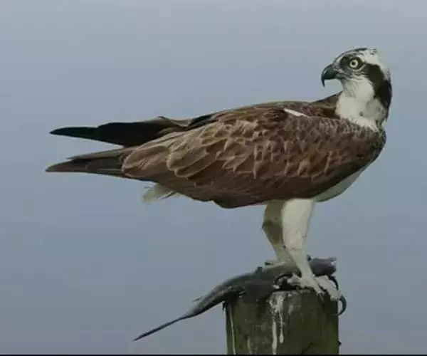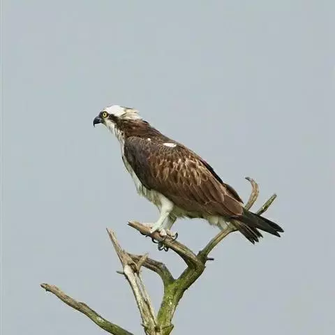 鹗(学名:Pandion haliaetus):是隼形目、鹗科、鹗属仅有的一种中型猛禽。雌雄相似。体长51-64厘米,体重1000-1750克。头部白色,头顶具有黑褐色的纵纹,枕部的羽毛稍微呈披针形延长,形成一个短的羽冠。头的侧面有一条宽阔的黑带,从前额的基部经过眼睛到后颈部,并与后颈的黑色融为一体。上体为暗褐色,略微具有紫色的光泽。下体为白色,胸部的暗色纵纹和飞羽,以及尾羽上相间排列的横斑均极为醒目。虹膜淡黄色或橙黄色,眼周裸露皮肤铅黄绿色,嘴黑色,蜡膜铅蓝色,脚和趾黄色,爪黑色。