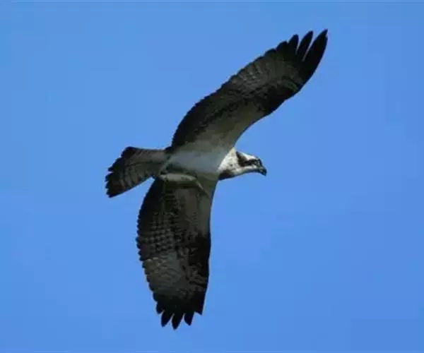 鹗是中型猛禽,头部白色,头顶具有黑褐色的纵纹,枕部的羽毛稍微呈披针形延长,形成一个短的羽冠。头的侧面有一条宽阔的黑带,从前额的基部经过眼睛到后颈部,并与后颈的黑色融为一体。上体为沙褐色或灰褐色,略微具有紫色的光泽。下体为白色,颏部、喉部微具细的暗褐色羽干纹,胸部具有赤褐色的斑纹,飞翔时两翅狭长,不能伸直,翼角向后弯曲成一定的角度,常在水面的上空翱翔盘旋,从下面看,白色的下体和翼下覆羽同翼角的黑斑,胸部的暗色纵纹和飞羽,以及尾羽上相间排列的横斑均极为醒目。