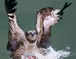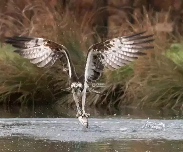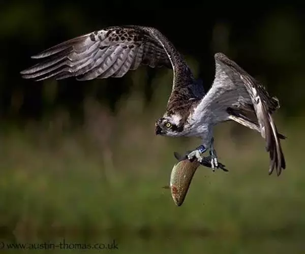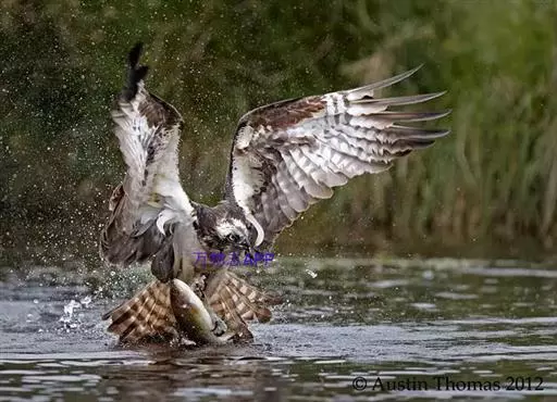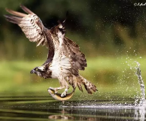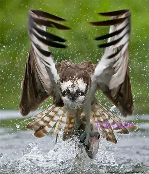 照片中,鹗眼神坚定,飞速朝目标猎物飞去,在飞出水面的一瞬间,它的两只爪各抓住一条鳟鱼,翅膀完全张开,翼展足足有1.8米宽,且十分有力。49岁的俄罗斯业余摄影师伊戈尔已经在此等候有好几个小时,捕捉到这一幕是完全出乎意料的,因为通常情况下鹗要尝试6到7次才可能成功捕捉到猎物,像这样一次出动就捕到两只猎物的情况十分罕见,而且鹗的速度非常快,就使得拍摄更加困难。