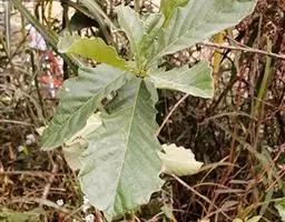 叶片长倒卵形至椭圆形,长6-20厘米,宽3-8厘米,顶端圆钝,基部为不甚平整的耳形,叶缘有4-7对深浅不等的圆钝锯齿,叶面淡绿色,叶背粉绿色,侧脉每边6-9条;叶柄长3-5毫米。