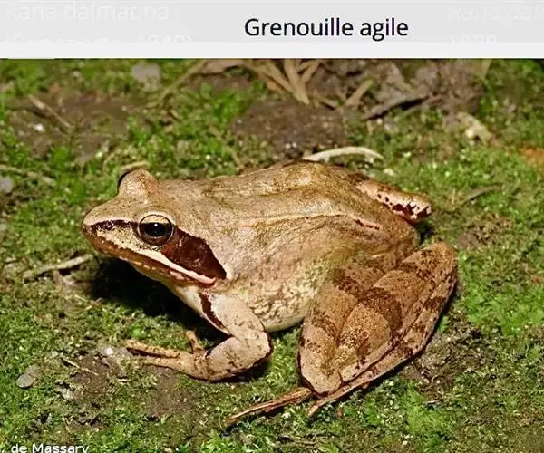 中国林蛙(学名:Rana chensinensis):雌蛙体长44~53毫米,雄蛙较小;头较扁平,头长宽相等或略宽;吻端钝圆,略突出于 下颌,吻棱较明显;鼻孔位于吻眼之间,鼻间距大于眼间距而与上眼睑宽。背侧褶在鼓膜上方呈曲折状;后肢长为体长的185%左右,后肢前伸贴体时胫跗关节超过眼或鼻孔;外侧3趾间几乎近2/3蹼;鼓膜部位有三角形黑斑。雄蛙第一指基部的两个大婚垫内下侧间的间距明显,近腕部一团不大于指部一团;有一对咽侧下内声囊。