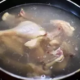 2.烧锅下油,放入姜片炝香锅,注入适量清汤,加入冬瓜,用中火煮至冬瓜六成熟。
