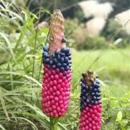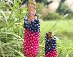 花序柄长15-30厘米,粗0.8-1.2厘米;佛焰苞外面绿色,内面白色,长4-6厘米,稀更长,宽3-3.5厘米,具长1厘米的尖头,果期宿存而不增大。肉穗花序长1.5-3厘米,花期粗1厘米;果序近球形,宽椭圆状,长4.5厘米,粗3厘米,具长5-7毫米的梗。花期6-7月,果期8月。