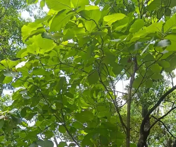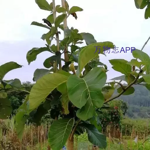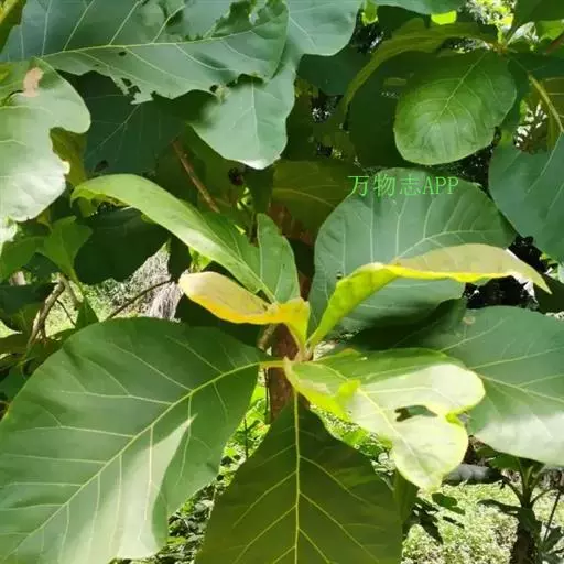 叶对生,厚纸质,全缘,卵状椭圆形或倒卵形,长15-45(-70)厘米,宽8-23-(37)厘米,顶端钝圆或渐尖,基部楔形下延,表面粗糙,有白色突起,沿脉有微毛,背面密被灰褐色至黄褐色星状毛;侧脉7-12对,第三回脉近平行,在背面显著隆起;叶柄粗壮,长2-4厘米。