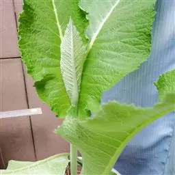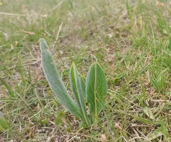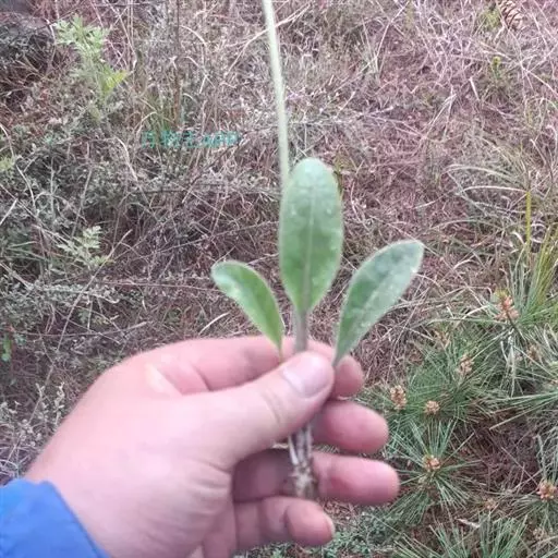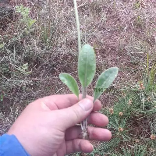 基生叶数个,莲座状,具短柄,在花期生存,长圆形或卵状长圆形,长5-10厘米,宽1.5-2.5厘米,顶端钝,具小尖,基部楔状至渐狭成具狭至宽翅叶柄,两面被密或疏白色蛛丝状绒毛;茎叶少数,向茎上部渐小,下部叶倒披针形,或倒披针状长圆形,长4-8厘米,宽0.5-1.5厘米,钝至尖,无柄,基部半抱茎,上部叶小,披针形,苞片状,顶端尖。