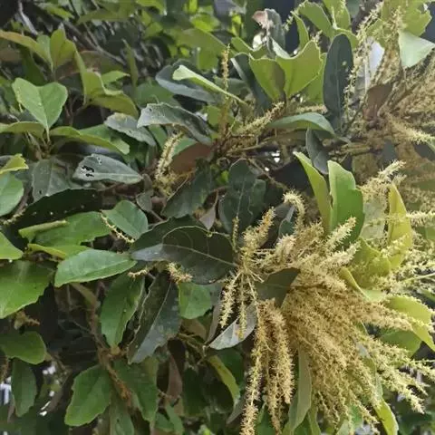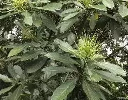 苦槠〔学名:Castanopsis sclerophylla (Lindl.)Schott.〕国家二级保护植物 ,是山毛榉目,壳斗科,锥属乔木,高稀达15米,胸可达50厘米,树皮浅纵裂,枝、叶二列均无毛。通常一侧略短且偏斜,叶片革质,花序轴无毛,雄穗状花序通常单穗腋生,壳斗有坚果偶有2-3个,近圆球形,顶部短尖,果脐位于坚果的底部,4-5月开花,10-11月开始结果成熟。