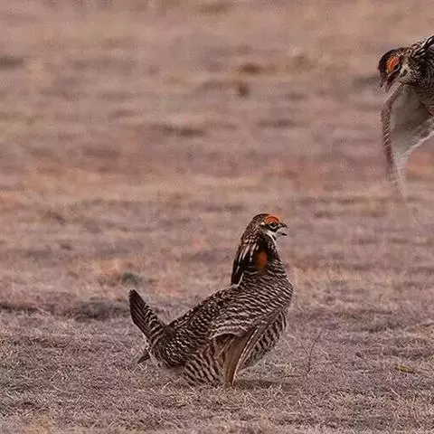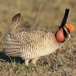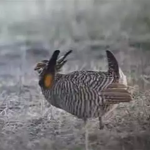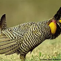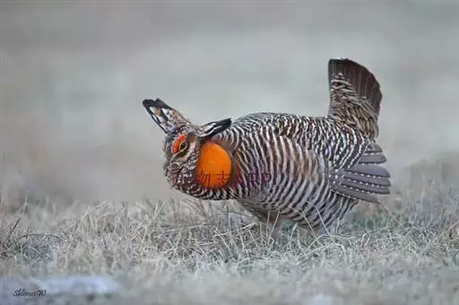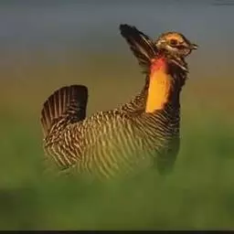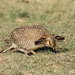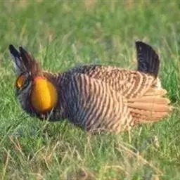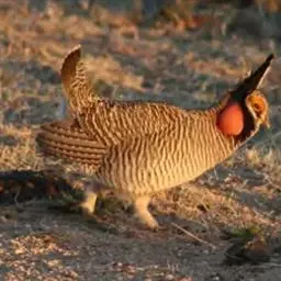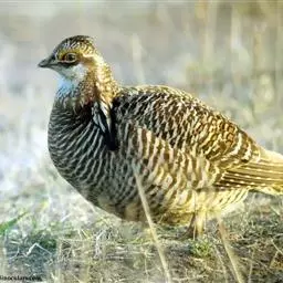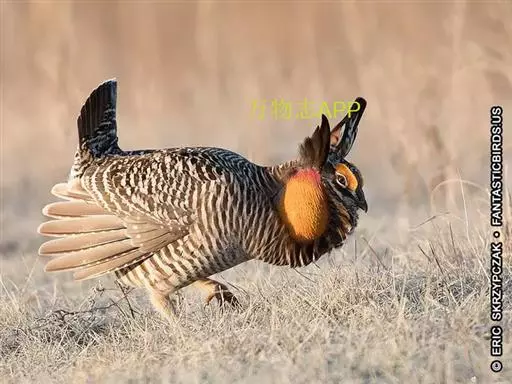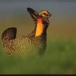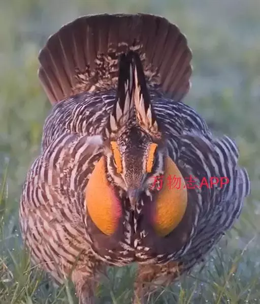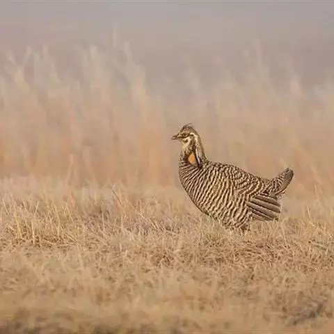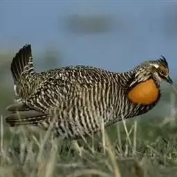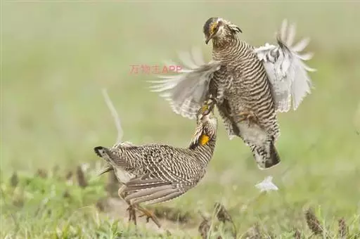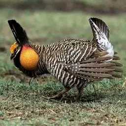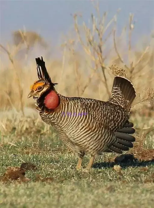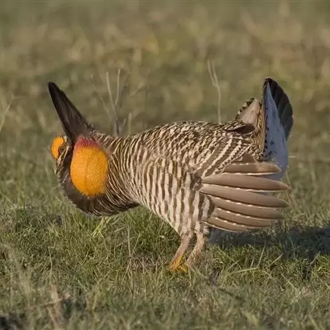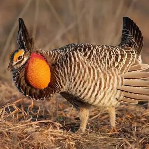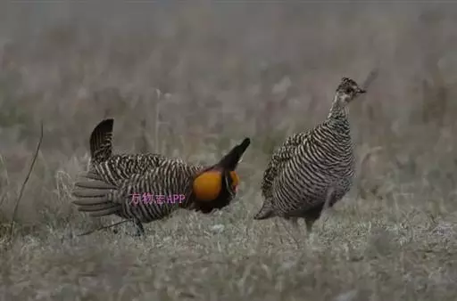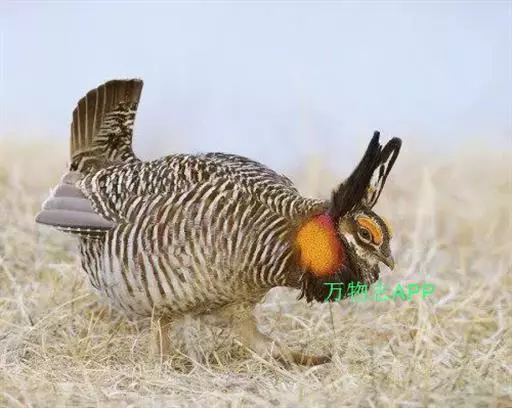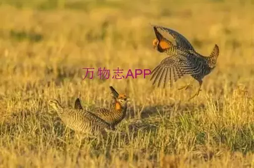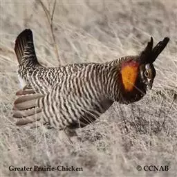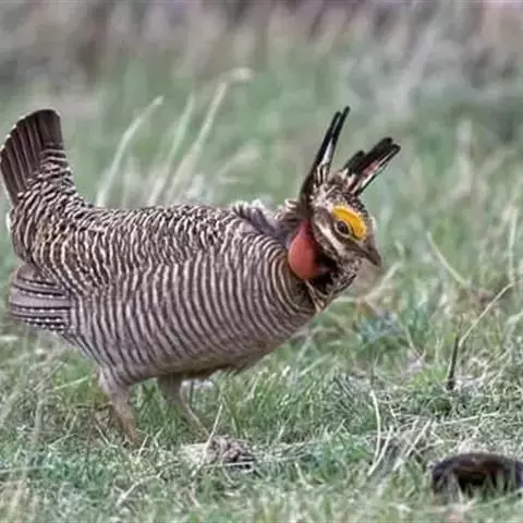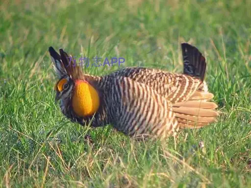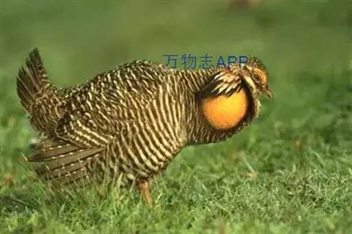 草原松鸡(学名:Tympanuchus cupido):体长43-47厘米,翼展69厘米,体重900-1100克。雄鸟头顶耸立的针状羽毛形成的两个尖顶羽冠。颈部和眼睛上方有黄橙色的膨胀的大气囊。雌鸟的上体是锈褐色,夹杂着黑色及皮黄色的的横斑,下体较淡。在交配季节,雄鸟会发出一个800米远都能听到的鸣叫声,胸部的气囊也会放大。虹膜褐色,嘴角黄色或白色,跗蹠被羽到趾。