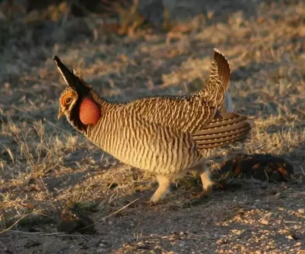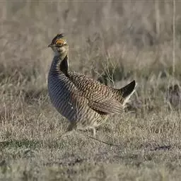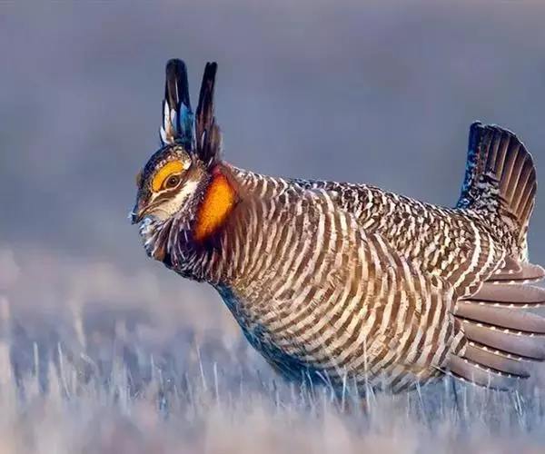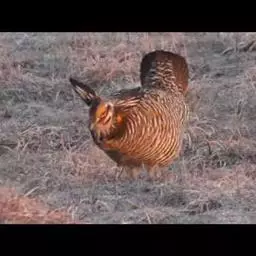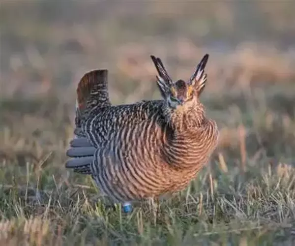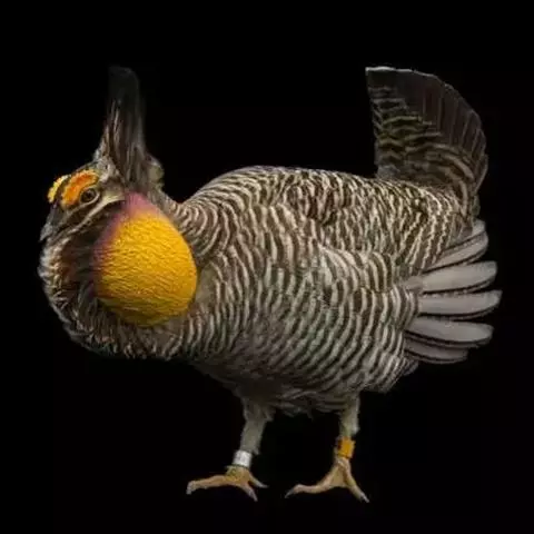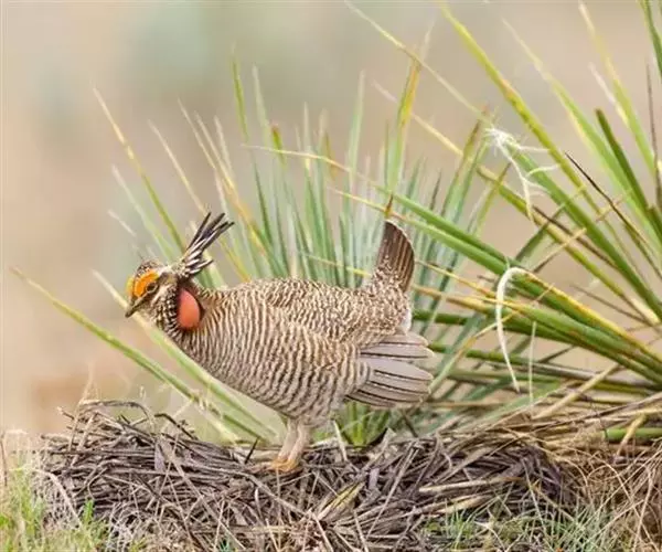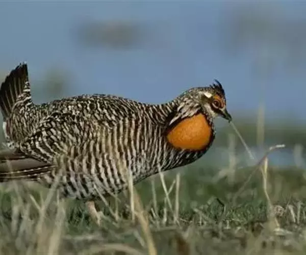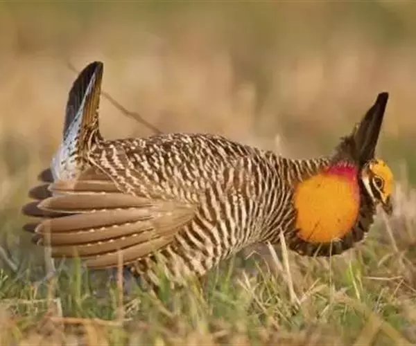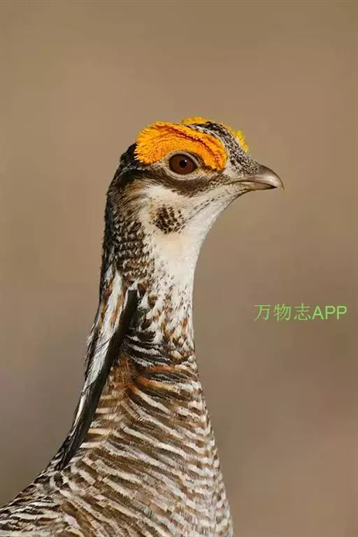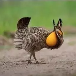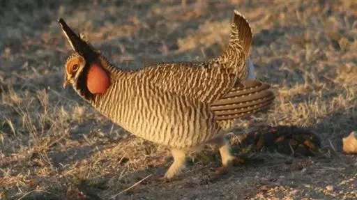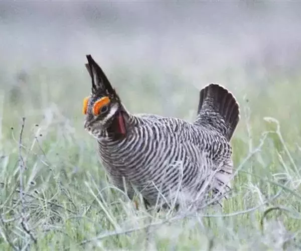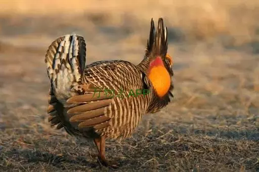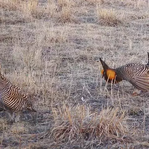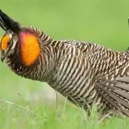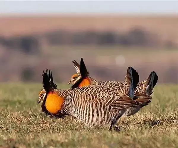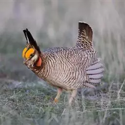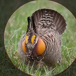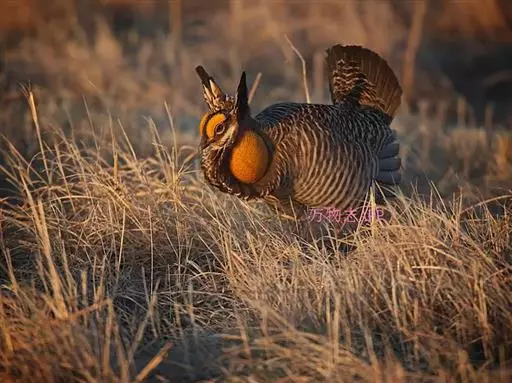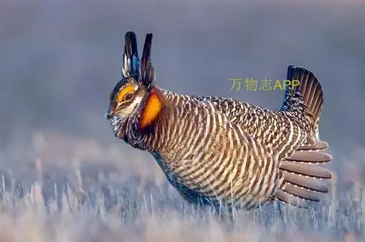 草原松鸡(学名:Tympanuchus cupido):体长43-47厘米,翼展69厘米,体重900-1100克。雄鸟头顶耸立的针状羽毛形成的两个尖顶羽冠。颈部和眼睛上方有黄橙色的膨胀的大气囊。雌鸟的上体是锈褐色,夹杂着黑色及皮黄色的的横斑,下体较淡。在交配季节,雄鸟会发出一个800米远都能听到的鸣叫声,胸部的气囊也会放大。虹膜褐色,嘴角黄色或白色,跗蹠被羽到趾。