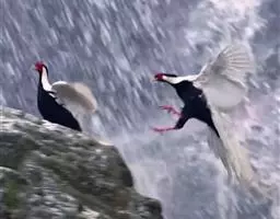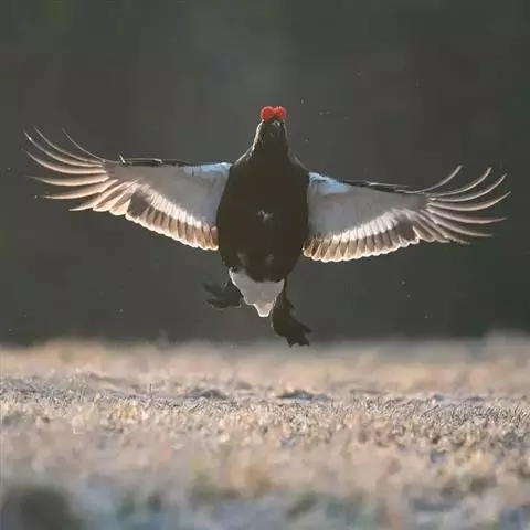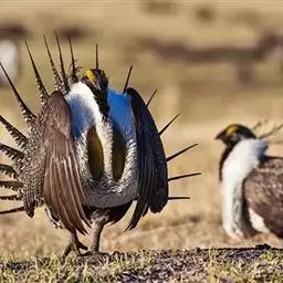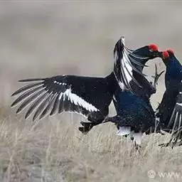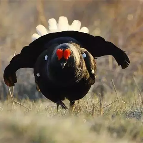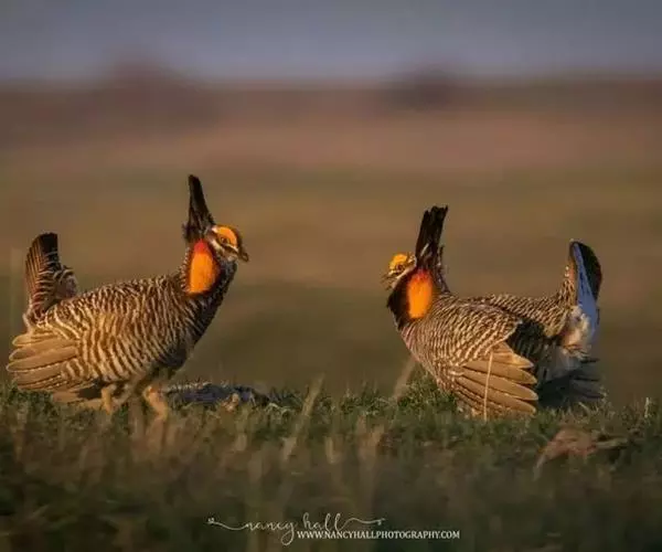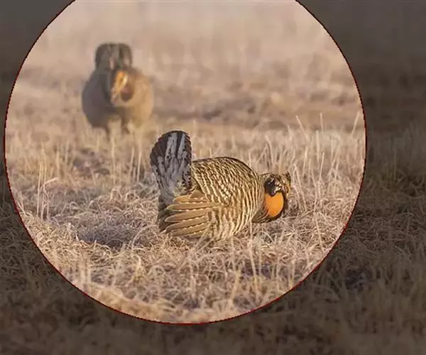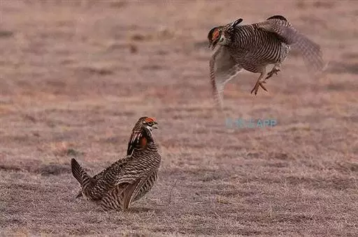草原松鸡举行这种奇特的比舞炫耀。开始之前,雄松鸡作短程跑步,接着就表演快节拍的踢跶舞,发出打鼓一般的声音。它竖尾展羽,同时鼓起头部两侧色彩鲜艳的气囊。松鸡发出奇怪而宏亮的轰隆轰隆声,于是气囊逐渐萎缩,接着发出的声音却和农庄的鸡啼一样。它同时上跃,一落地就追逐任何靠近的雄鸟。两只雄鸟于是交斗一番,用翅膀互相击打。