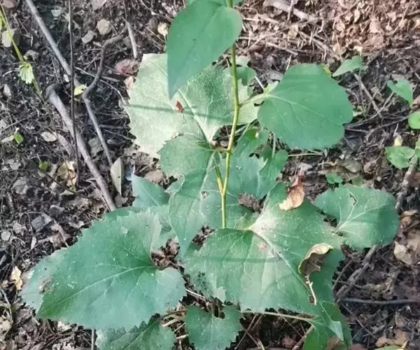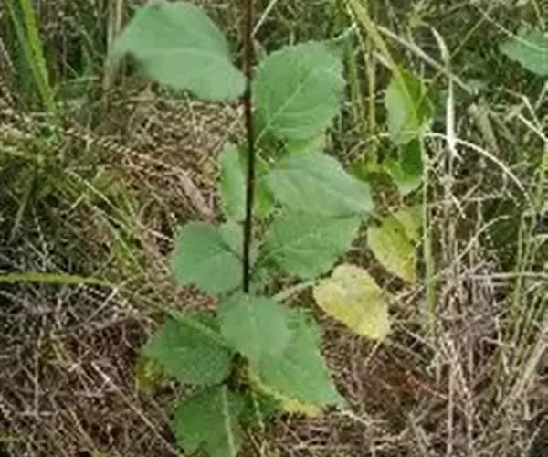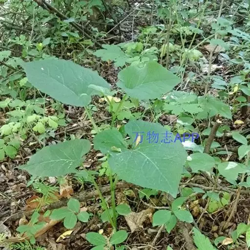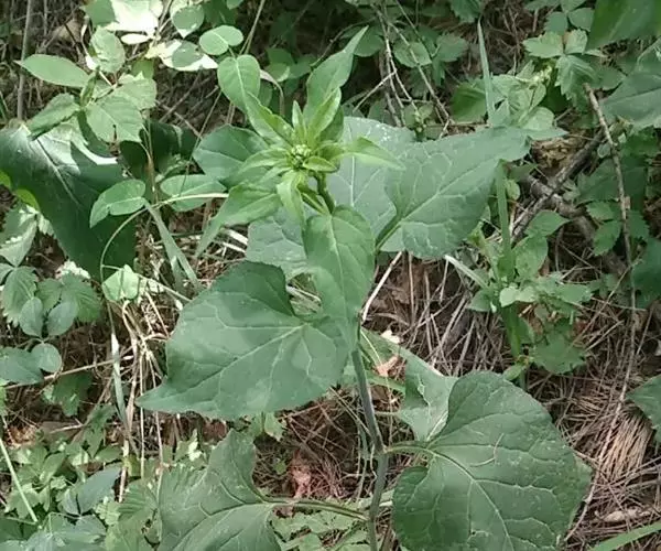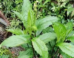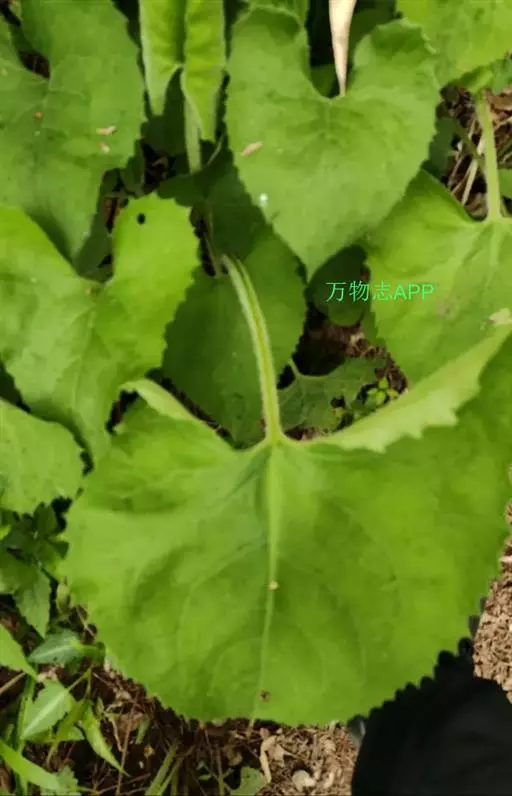 根状茎粗壮。茎直立,高100-150厘米,上部有斜升的分枝,被微毛。基部叶在花期枯萎,叶片心形,长9-15厘米,宽6-15厘米,边缘有具小尖头的齿,顶端尖,基部急狭成长约10-15厘米被微毛的柄;中部叶较小,卵状三角形,基部圆形或稍截形,有具翅的短柄;上部叶小,矩圆披针形或条形;全部叶两面被微糙毛,下面浅色,有三或五出脉,网脉显明。