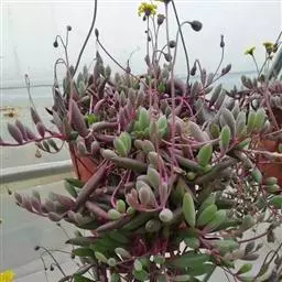叶子表面宽厚,富肉质感且带有磨纱质感,看像石头质地;开红色小花,生于植株顶部,倒伞形密生,形状像花…