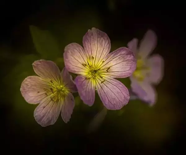 花序腋生和顶生,长于叶,被倒生短柔毛和开展的长腺毛,每总花梗具2花,顶生总花梗常数个集生,花序呈伞形状;花梗与总花梗相似,等于或稍短于花;苞片钻状,长3-4毫米,被短柔毛;萼片长卵形或近椭圆形,长5-7毫米,宽3-4毫米,先端急尖,具长约1毫米尖头,外被短柔毛或沿脉被开展的糙柔毛和腺毛;花瓣淡紫红色,倒卵形,稍长于萼,先端圆形,基部宽楔形,雄蕊稍短于萼片,中部以下被长糙柔毛;雌蕊稍长于雄蕊,密被糙柔毛。