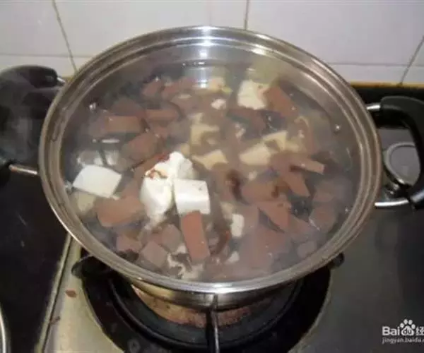 4. 放鸭血块、豆腐块,煮至豆腐漂起;