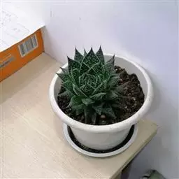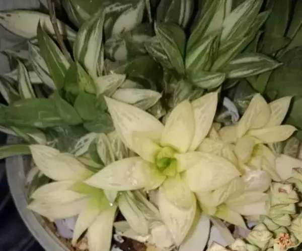 京之华锦(学名:Haworthia cymbiformis f. variegata)是独尾草科(也称阿福花科、日光兰科)瓦苇属的一种植物。也叫凝脂菊,为京之华的斑锦变异品种,植株群生,扁棒状三角形肉质叶排成莲座状,叶表平展,背部隆起,全叶有黄色或白色纵向缟纹,少数叶整片都呈黄色或白色。株型小巧,适合点缀阳光充足的阳台、窗台等处。