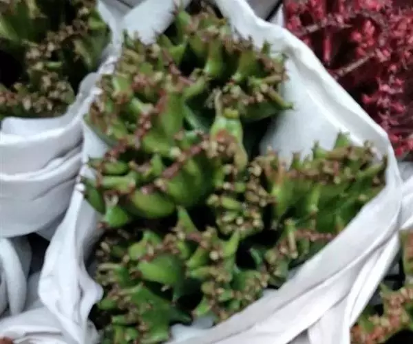 魁伟玉原产南非,是一种大戟科的多年生肉质植物,植株具粗圆筒形肉质茎,有10条以上的突出棱,…