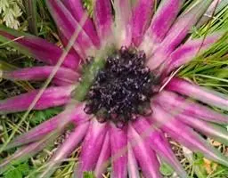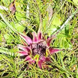 茎粗壮,基部残存密集棕褐色叶片;头状花序顶生,总苞片卵形叶状,近似膜质,呈白色或淡绿黄色;花棕紫色,全为管状花;瘦果刺毛状。