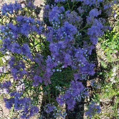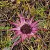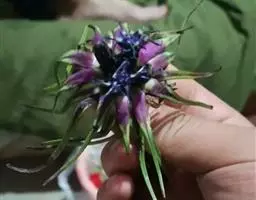 头状花序10-20个,在茎顶密集成球形的总花序,无小花梗或有短小花梗。总苞半球形,直径1厘米;总苞片3-4层,边缘或全部紫褐色,先端急尖,外层被稀疏的长柔毛,外层长圆形,长1.1厘米,宽5毫米,中层及内层披针形,长1.5-1.8厘米,宽2毫米。小花紫色,长1.6厘米,管部长7毫米,檐部长9毫米。