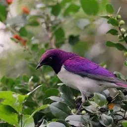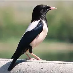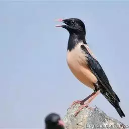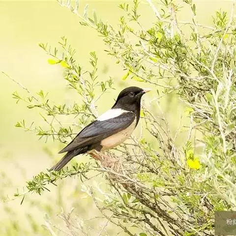 粉红椋鸟是雀形目椋鸟科粉红椋鸟属鸟类。头顶具紫色羽冠;头部、颈、颏、喉黑色具蓝紫色金属光泽;背和腹粉红色;两翅和尾黑褐色;虹膜暗褐色;嘴黄色或粉红色,上嘴基部黑色,冬季嘴为褐色;脚黄色。嘴较其他椋鸟短而钝,上嘴弯曲较明显;脚较粗壮,爪发达。粉红椋鸟分布于欧洲东南部、西伯利亚、西亚、印度和斯里兰卡岛等地区,在中国新疆西部和北部、西藏西部、澳门、台湾等地也能看到其身影。栖息于干旱平原、荒漠或半荒漠地区。常成群活动,鸣声嘈杂。主要在地面觅食,以甲虫、蝗虫、毛虫等各种昆虫为食,偶食植物果实和种子。繁殖期5—7月,营巢于岩壁缝隙、树洞中,每窝产卵4—6枚,卵白色或淡蓝色,孵化期13—15天。雏鸟晚成性,由雌雄亲鸟共同喂养。粉红椋鸟种群数量较少,已被列入中国国家林业局2000年8月1日发布的《国家保护的有益的或者有重要经济、科学研究价值的陆生野生动物名录》。