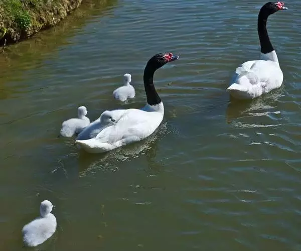 每窝产卵4-8枚,卵呈奶油色,平均重量为220克左右。孵卵工作由雌鸟单独承担,雄鸟则在巢的附近警戒,当雌鸟离巢觅食的时候,也会暂时代孵。孵化期大约为34—39天。黑颈天鹅偶尔也有集群营巢的,但由于缺乏足够的食物和营巢地点,将发生十分激烈的争斗,从而导致平均窝卵数和繁殖成功率的降低很低。