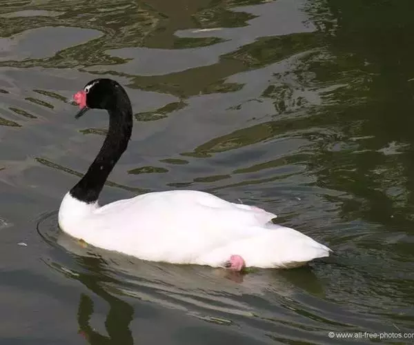 黑颈天鹅雄鸟和雌鸟羽色十分相似,只是雌鸟的体形比雄鸟要小。体长为90-130厘米,体重为3.5-4.4千克,是世界上体形最小的天鹅。身体的羽毛同大天鹅一样,也是雪白的颜色,但它的头部和颈部却是黑色的,因而显得与众不同,别具一格。在它的前额上,还生有一个鲜红色的大肉冠,叫做疣突,十分鲜艳而发达。它的脸颊呈红色,嘴为蓝灰色,嘴甲呈灰白色,跗蹠和蹼均为粉红色。