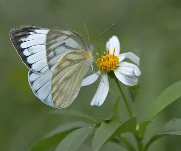 成虫:翅展45-60mm。体躯细长,背面黑色,头部和胸部被白色绒毛;腹面白色。触角端部匙形。翅正面白色;前翅的前缘脉黑色,顶角有三角形黑斑,并与外缘的黑斑相连而延伸到Cu2脉以下,黑斑的内缘呈锯齿状;亚端在m3室及cu2室各有1个黑斑,后翅前缘中部有1个黑斑,这3个黑斑均较菜粉蝶大而圆;后翅外缘各脉端均有三角形的黑斑。翅反面白色或乳白色,除前翅2枚黑斑尚存外,其余斑均模糊。雌蝶斑纹较明显,反面基部的黑鳞区较雄蝶宽。