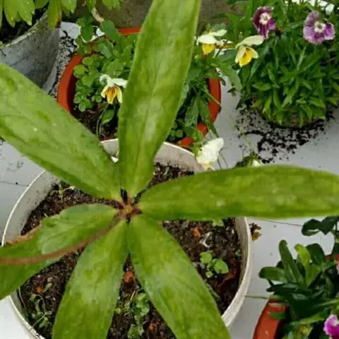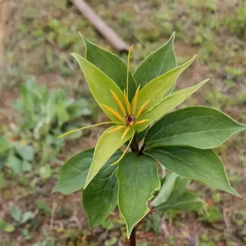 花梗长4.5-12厘米;外轮花被片绿色,极少带紫色,叶状,通常4(-5)枚,纸质,平展,倒卵状披针形、矩圆状披针形或倒披针形,长2-3.5厘米,宽(0.6-)1-3厘米,先端渐尖,基部圆形或宽楔形;内轮花被片黄绿色,条形,长1-2厘米;花药长约1厘米,花丝基部稍扁平,长约5-7毫米;药隔突出部分长约6-8(10)毫米;子房近球形,紫褐色,顶端无盘状花柱基,花柱具4-5分枝,分枝细长,并向外反卷,比不分枝部分长2-3倍。蒴果浆果状,不开裂,直径约1厘米,具几颗种子。
