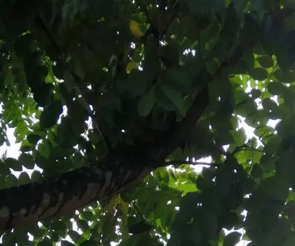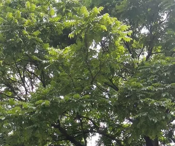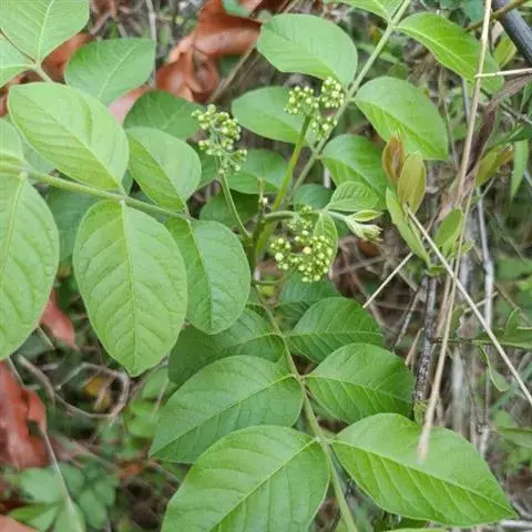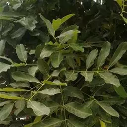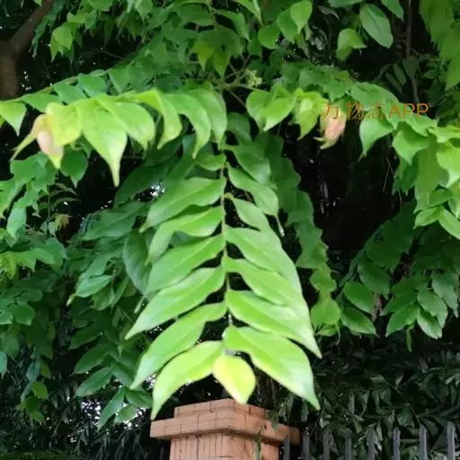 叶通常为偶数羽状复叶,长30-50厘米,无毛,小叶10-16枚;叶柄圆形柱形,长4.5-7厘米;小叶互生,纸质,卵形至长圆状披针形,长7-12厘米,宽3-5厘米,先端渐尖,基部圆形,偏形,偏斜,下侧常短于上侧,两面均无毛或近无毛,侧脉每边10-15条,至边缘处分叉,背面侧脉稍明显突起;小叶柄长4-8毫米。