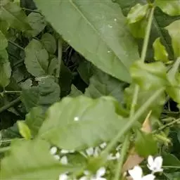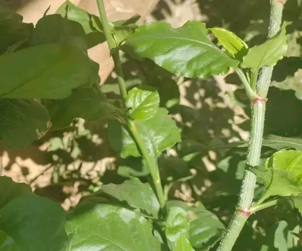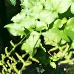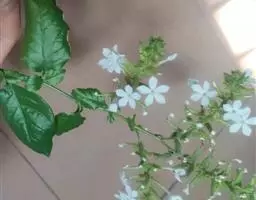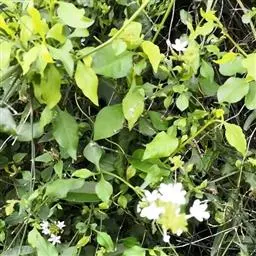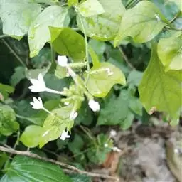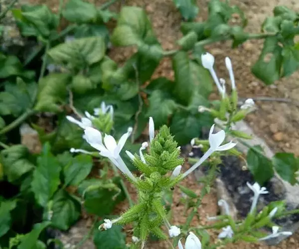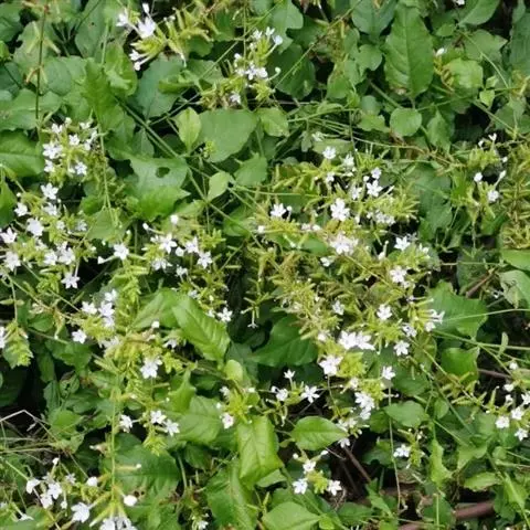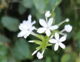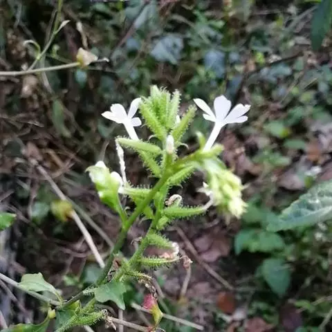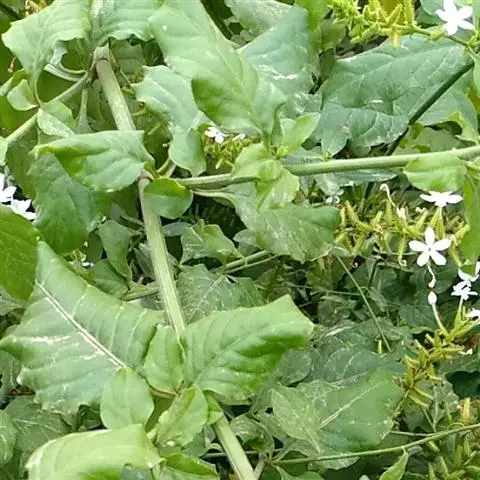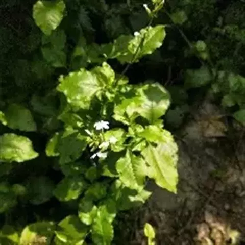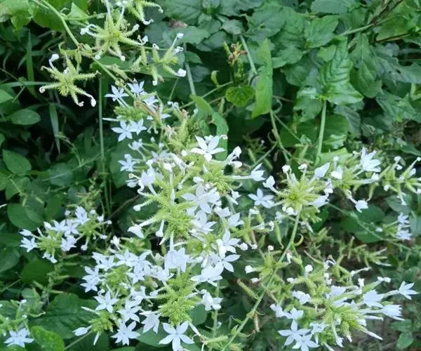 白花丹,多年生蔓生亚灌木状草本,高2-3m。茎细弱,基部木质,多分枝,有细棱,节上带红色,除具腺外,光滑无毛。单叶互生;叶柄基部扩大而抱茎;叶片纸质,卵圆形至卵状椭圆形,长4-10cm,宽1.5-5cm,先端尖,基部阔楔形,无毛,全缘。